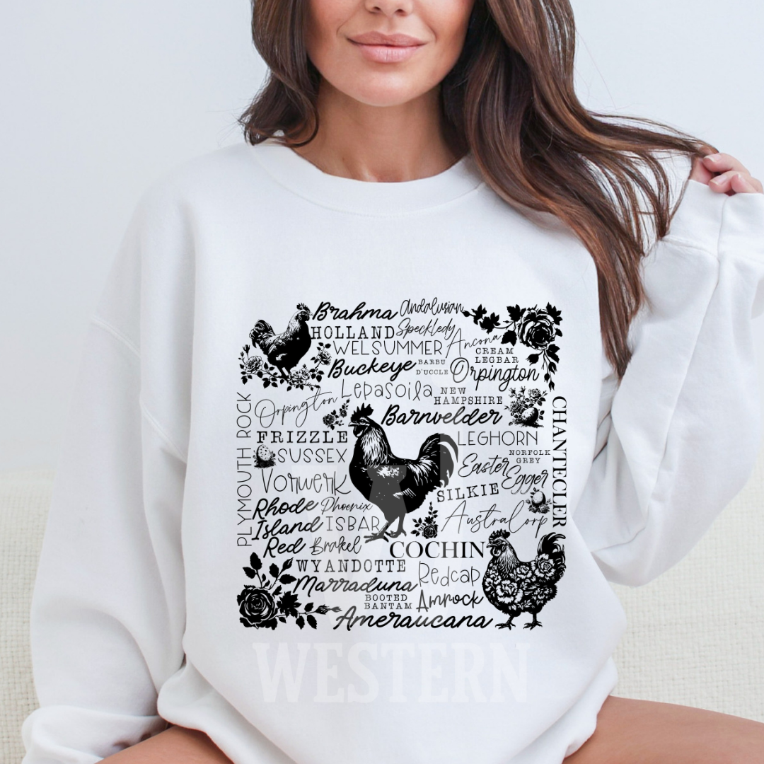 Show off your flock love with our Chicken Breed Tee! This charming design features a collection of popular chicken breeds — from Ameraucana and Orpington to Cochin and Wyandotte — arranged in a creative word art layout, framed with floral accents and centered with a proud rooster and hen silhouette.